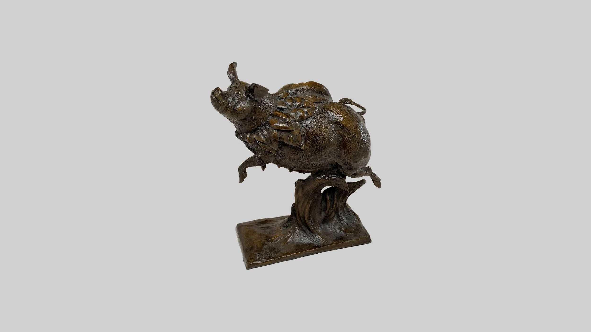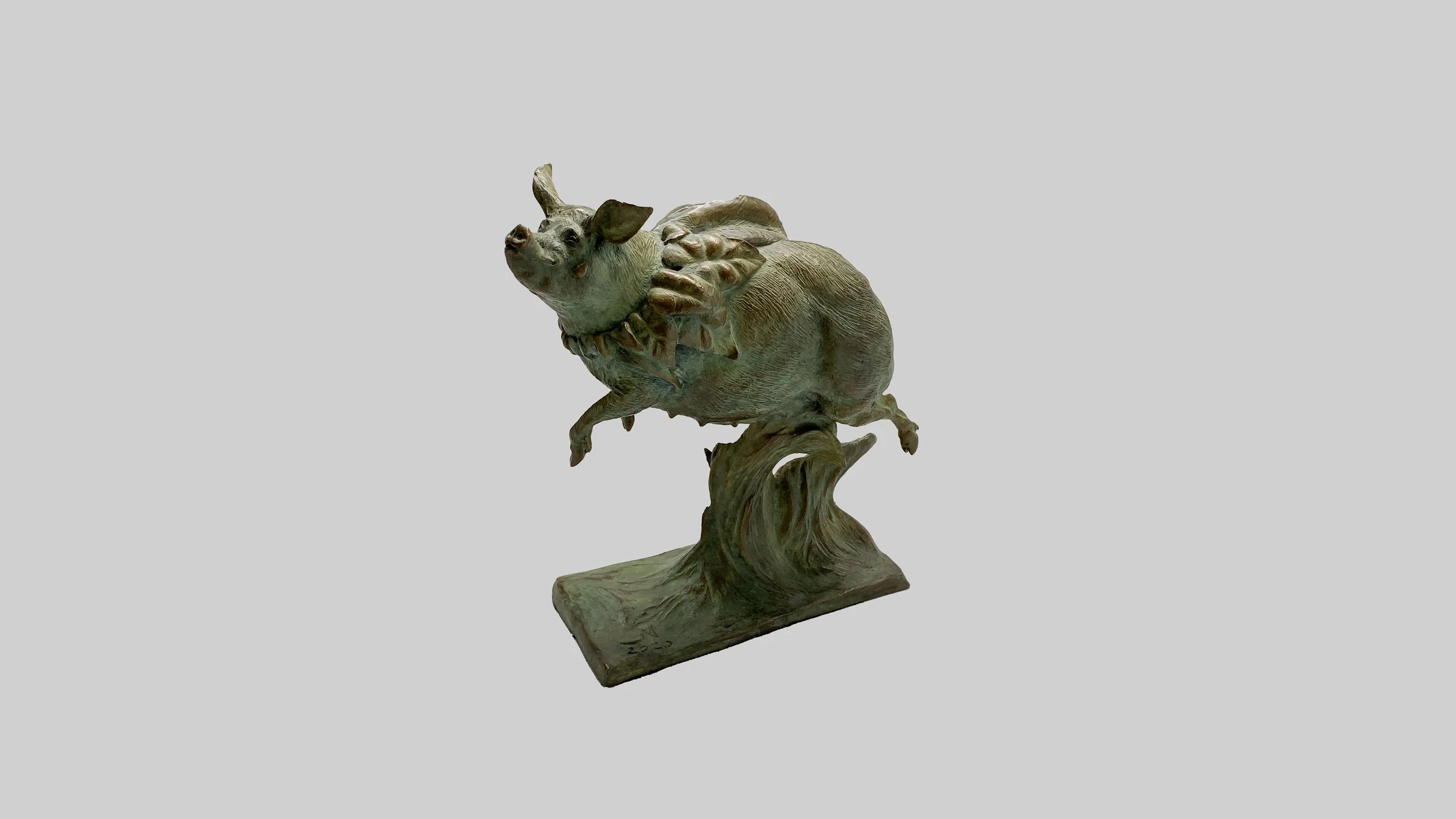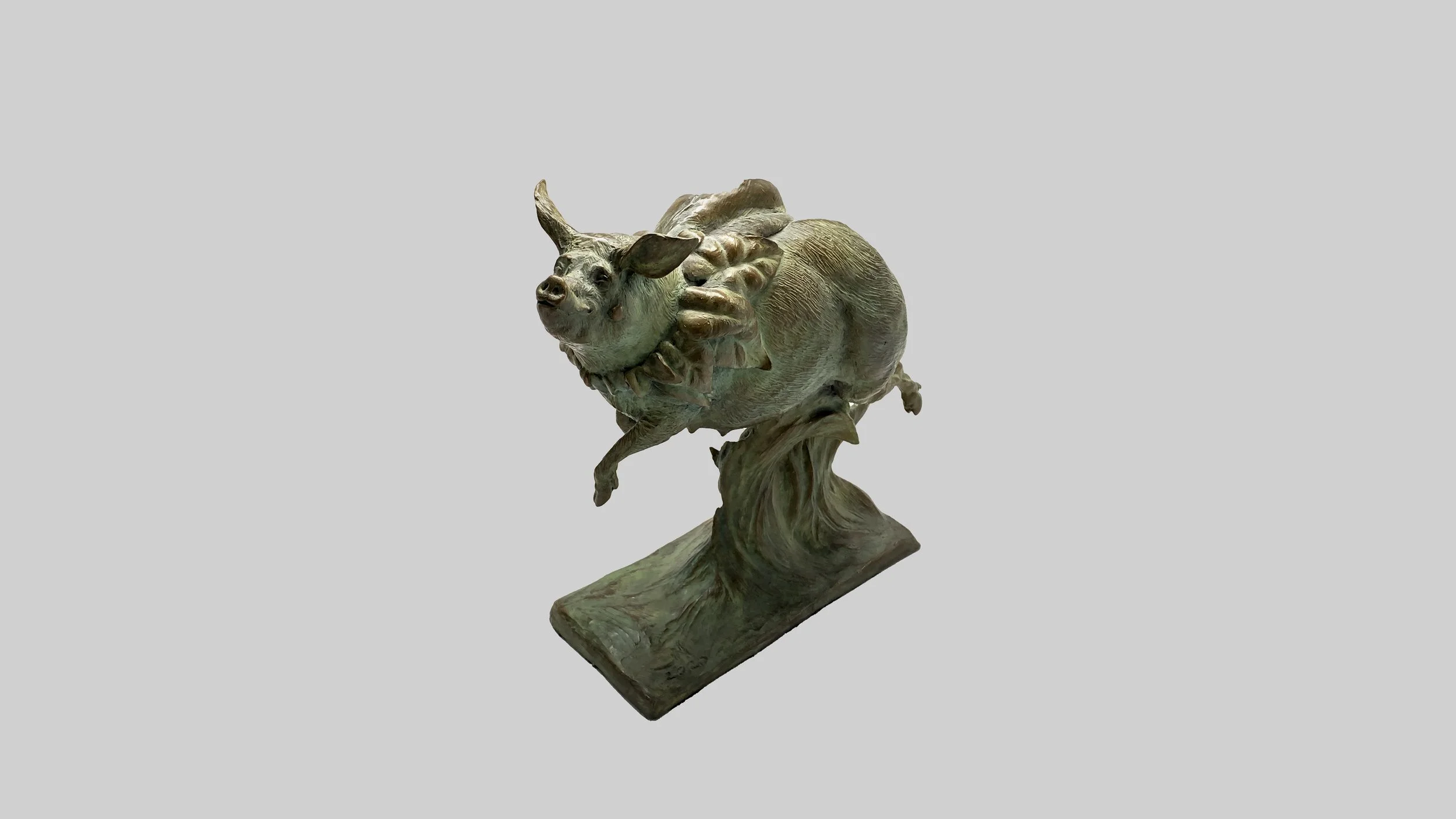 Migration No. 1 depicts a sow as she discovers the ability to fly. The piece was artfully crafted in clay before being cast in bronze. Available in French Brown or Green Patina.